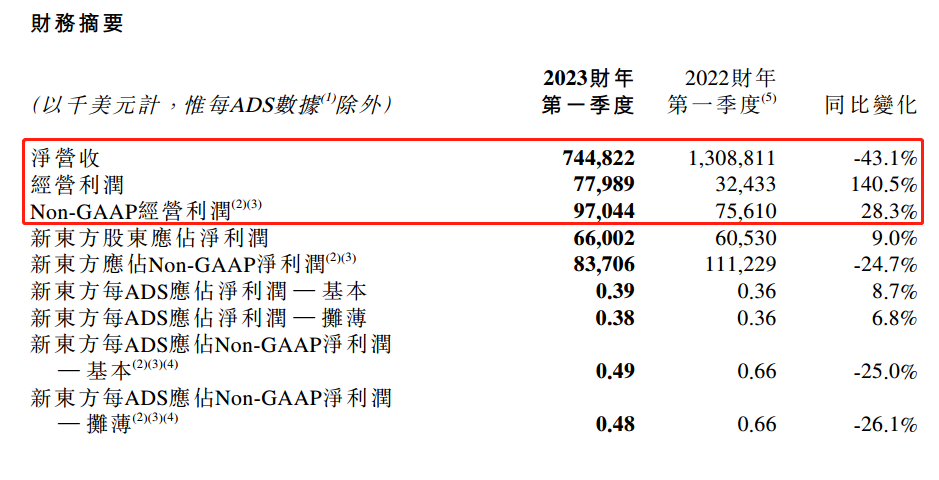 昨日,新东方在港股和美股市场发布了《截至2022 年8 月31 日止第一季度的未经审核财务业绩》公告。其中提到,净营收总额7.44亿元,同比减少43.1%;经营利润7798万美元,同比增长140.5%;非公认会计准则下经营利润97044万元,同比增长28.3%。综合看来,新东方的营收虽然尚未恢复到“双减”政策之前,但盈利能力已经大幅改观。其中的积极变化,主要来自“东方甄选”直播间。