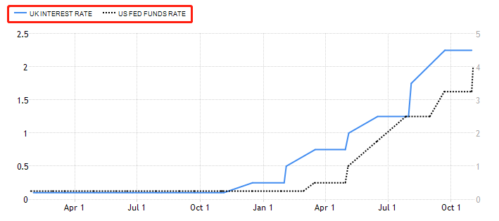 英格兰银行(即英国央行)和美联储的货币政策具有共振性。今年以来,英格兰银行共加息6次,美联储共加息5次,几乎每一次美联储加息之后都会触发英格兰银行的一次加息。从单次加息幅度看,英格兰银行倾向于“小步快走”,从15基点到25基点,又从25基点到50基点,至今还没有出现75基点的加息幅度。美联储倾向于“大开大合”,年内已经进行三次75基点(包含今日一次)的加息幅度。