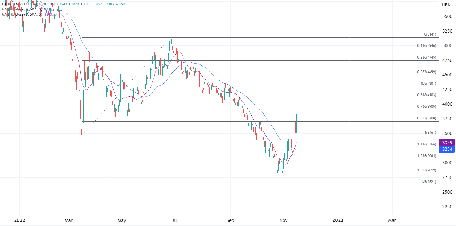 ATFX指出,上周港股在内地宣布放宽防疫限制至「5+3」后迎来强劲反弹,前两周累计大涨逾2000点后,昨日在内房股的爆发下走高,因政府最新出台宣布做好金融支持楼市的16条新政,进一步激发市场对于接下来更多政策支持的期待。