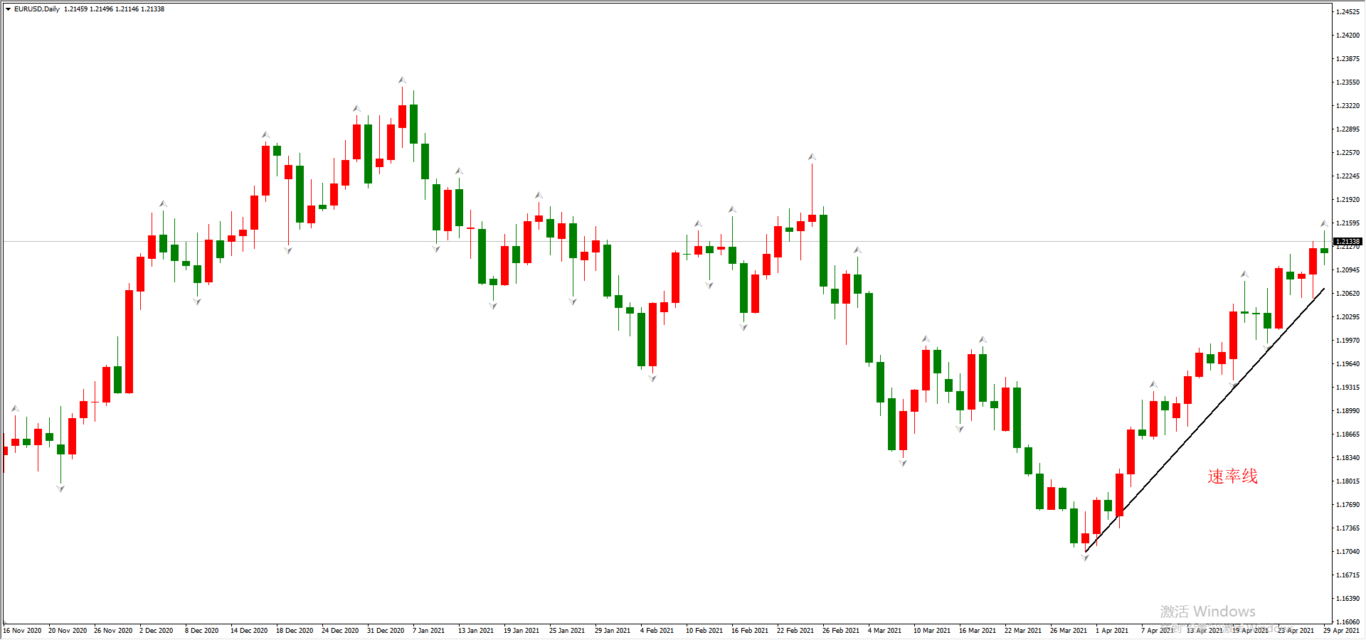 ATFX科普:健康的波段,往往会保持一个稳定的上涨/下跌速率。此处所说的速率线,与趋势线的表现形式基本相同,只不过关注点从趋势反向转变成了涨跌的速率。速率越高,代表波段倾角越大,行情走势越剧烈;速率越低,代表波段倾角越小,行情走势越平稳。比如: