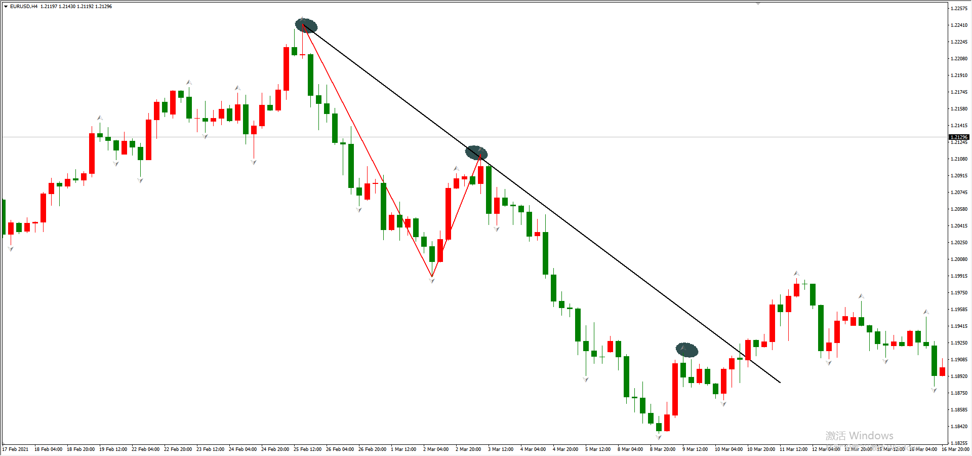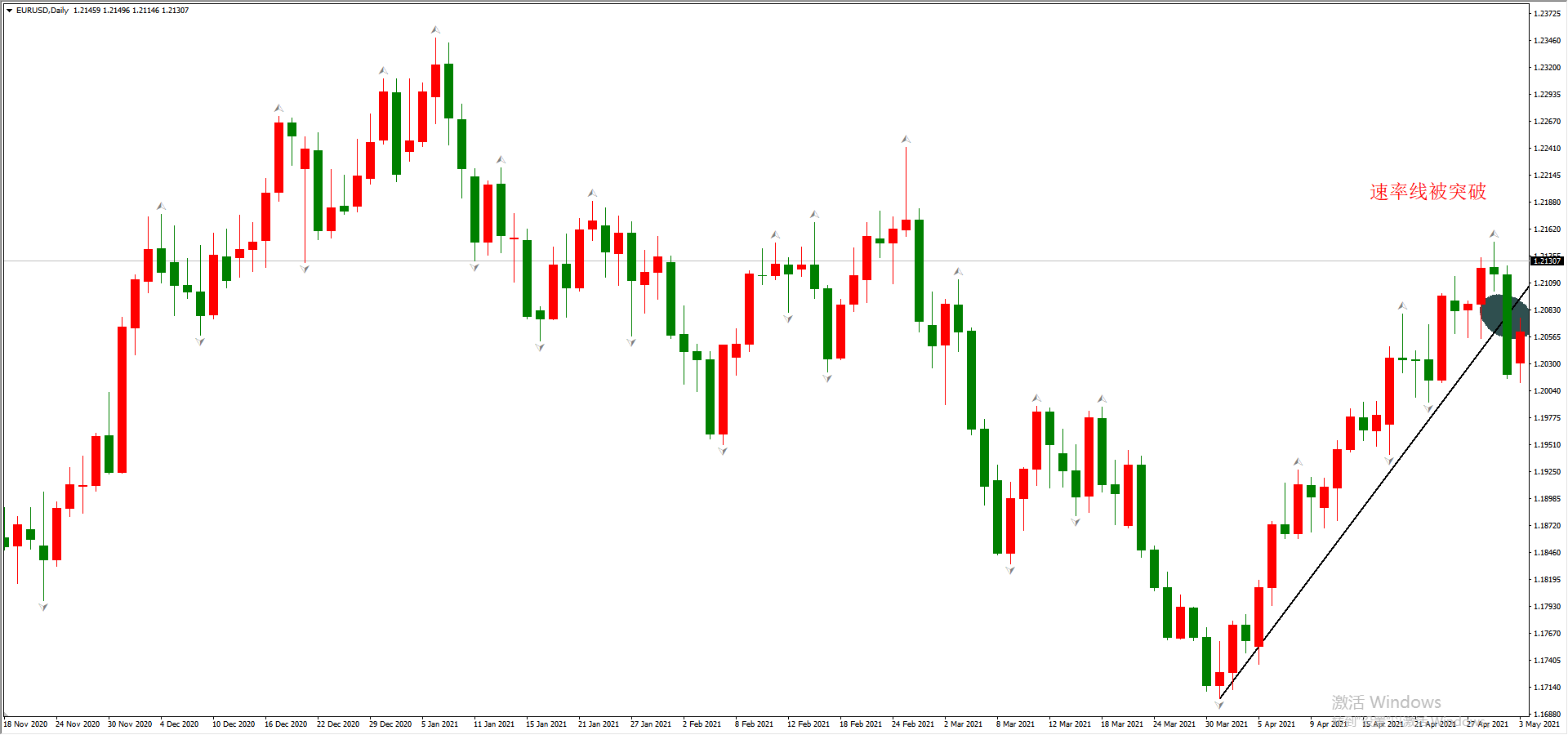 当图中速率线被单根K线突破时,代表当前的上涨波段终结,未来将出现新的波段。新波段的出现,也意味着前期所做的多单需要及时减/平仓。比如: