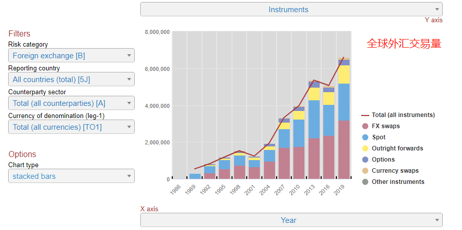 全球外汇日均交易量快速提高,1989年为5392亿美元,2007年为3.3万亿美元,2019年为6.59万亿美元,而是多年时间,外汇市场日均交易量翻了12倍有余。其中,外汇掉期(FX swaps)的交易量最大,在2019年达到了3.2万亿,近乎当年日均交易量的一半。掉期交易主要由大型银行参与,当A国家银行需要向B国家银行借款时,为防止汇率风险,两者会约定一个未来的汇率进行逆向操作。这个约定的汇率与外汇市场远期汇率不一定相同,取决于双方的主观判断。从上图可以看出, 掉期交易正处于稳步增长的过程中。即期外汇交易(Spot)的交易量居于第二的位置,2019年日均交易总量为1.98万亿美元,占比大约30% 。需要说明的是,CFD货币对汇率也属于即期汇率。上图中其余类别占比较低,不做过多介绍。