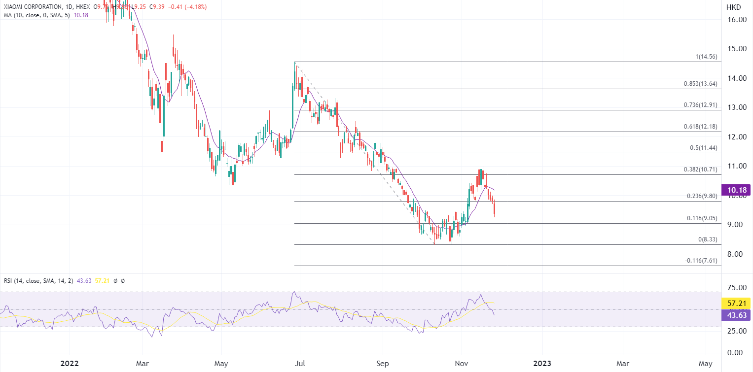 ATFX港股:11月23日财报数据显示,受宏观经济及消费电子行业整体低迷影响,小米(1810.HK)三季度营收净利润同比双降,季度同比转亏,手机出货量同比下跌8.4%,环比维持正增长,绩后小米股价今日盘中曾跌5%,为连续七个交易日向下。