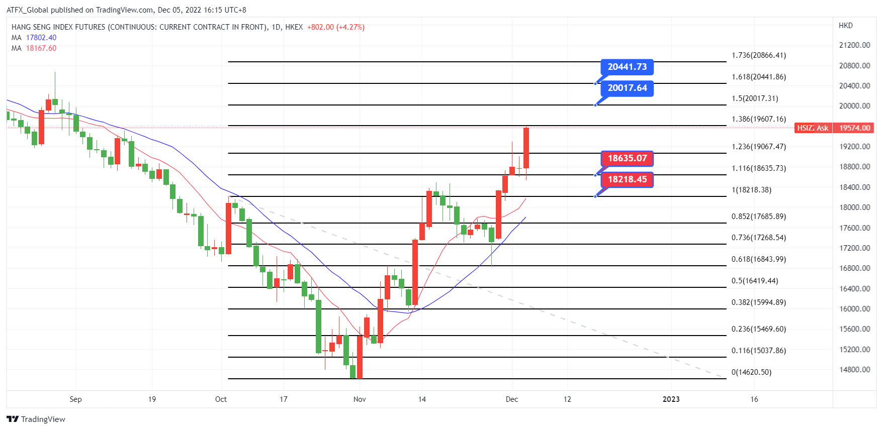 ATFX恒指:对中国严格的清零政策出现更广泛逆转的希望, 人民币兑美元汇率升破关键位7算水平,人民币兑美元汇率上涨至6.94,是自9月中旬以来首次跌破7大关, 为 2.5个月以来的最高水平。而随着更多城市放松防疫措施,将有助于刺激中国经济复苏的希望,周一中国股市大幅上涨, 中国蓝筹沪深300指数上涨逾1.96%,而上证综指上涨逾1.76%至9月中旬以来的最高水平。香港股市录得更强劲的涨幅曾逾800多点, 幅度逾4.3%, 是 2.5个月高点。波幅计算是从10月份触及的13年低点反弹超过20%,技术上现已确认进入牛市。基本面分析, 一个潜在的中国重新开放的路线及预测美联储加息步伐放慢, 这可能推动在未来几个月使中国及香港地区股票市场受益。但分析预计, 若中国及香港地区病例增加可能会刺激市场波动,特别是如果政府发出推迟重新开放计划的信号的话。