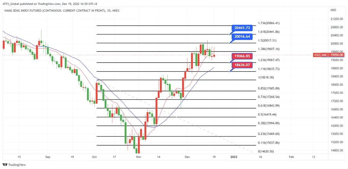 由于市场对2023年经济增长收缩预期升温,特别对中国内房及金融业相当压力可能加深,金融类及内房股继续有沽压,跌幅普遍多于1%过外。中国疫情虽然持续增加,不过中国政策锐意放宽防疫限制措施,其中影响较严重的是相关医疗和药业股份。周一普遍跌幅最大的股份行业,均以在医疗和药业股份。阿里健康(HK:0241)周一开盘轻微高走后,随后一直低走,收盘跌幅是8.2%,全日跌幅较其他同类股份较大。中国生物(HK:1177)跌幅4.38%,京东健康(HK:6618)和四环药业(HK:0460)分别跌幅4.17%及4.26%。估计在下一季在中国推出多项新政策措施下,以上股份表现可能受影响,走势继续低迷。