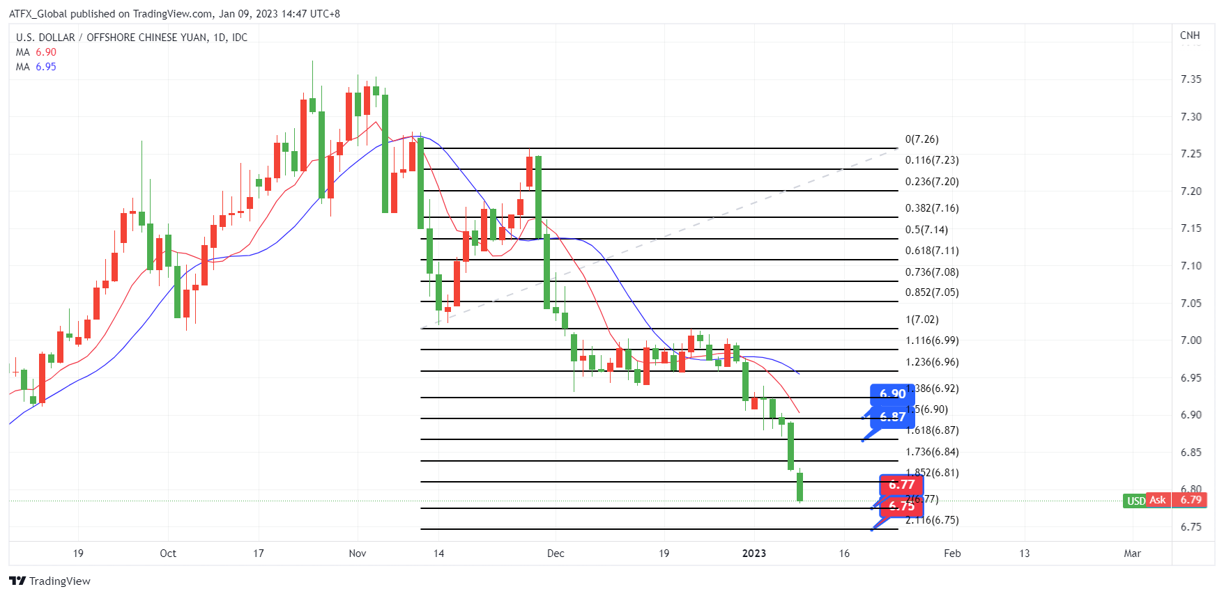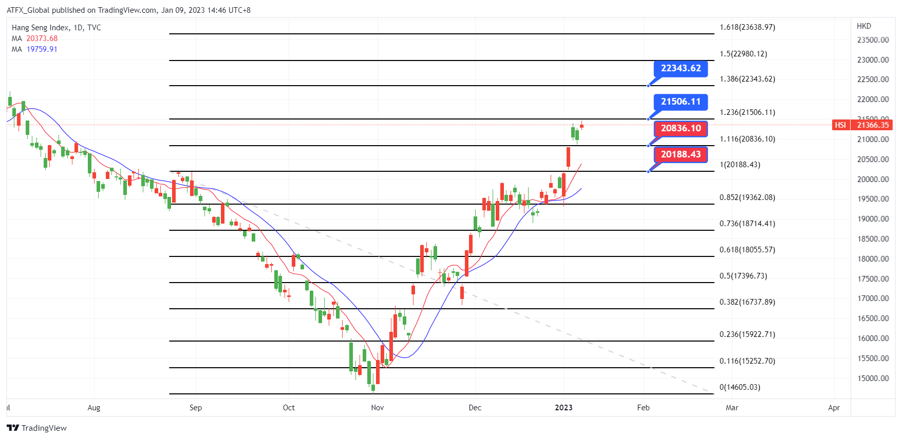 ATFX恒指:上周五的美国就业数据显示美国就业市场降温,市场也受到美联储将在未来几个月扭转其鹰派立场的希望的支撑,对美国加息幅度较小和中国开放边境的希望提振了全球经济前景中港股市周一上涨。 中国蓝筹股开盘上涨 0.7%,而香港股市上涨 1.4%, 午后两地股市保持升幅。 中国前景较乐观的预期持续, 中国人民币汇率也升至 8 月中旬以来的最高水平,低于 6.80。