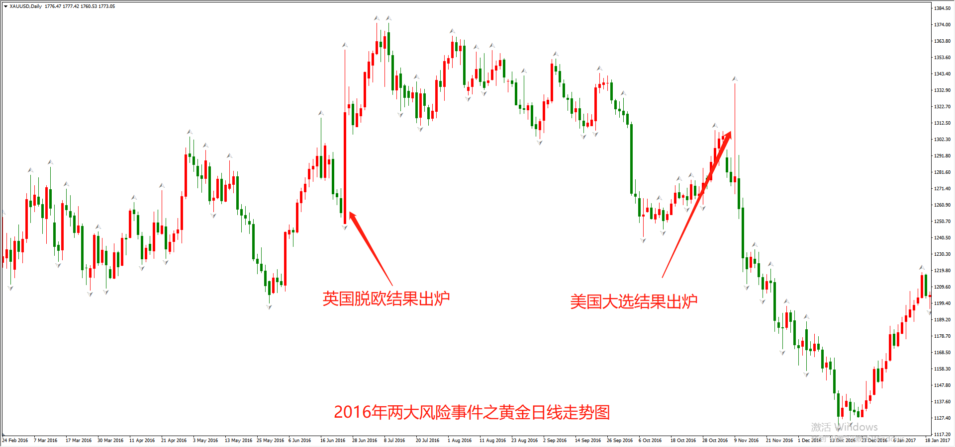 2016年11月9日,美国大选结果出炉,别人称作“疯子”的特朗普击败了传统政客希拉里,市场避险情绪先是大幅提高,之后大幅消退。黄金和白银都走出了先大涨后大跌的过山车行情。在这一天,白银最低价为18.25,最高价为18.98,最大涨幅4%;黄金最低价为1267,最高价1337,最大涨幅5.52%,高于白银。