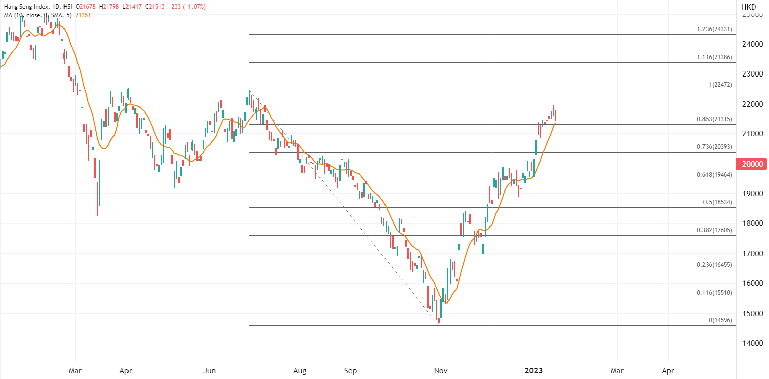 ATFX指,今日中国经济数据好于预期,但对于恒指拉动有限,进一步表明高位技术回吐压力,加上春节前更多投资者离场,整体交投氛围转为清淡,所以春节前继续大涨的机会不大。技术上关注22000至23386是当前关键高位区间阻力,10日均线和斐波位集合在21315是捍卫21000关口的关键。