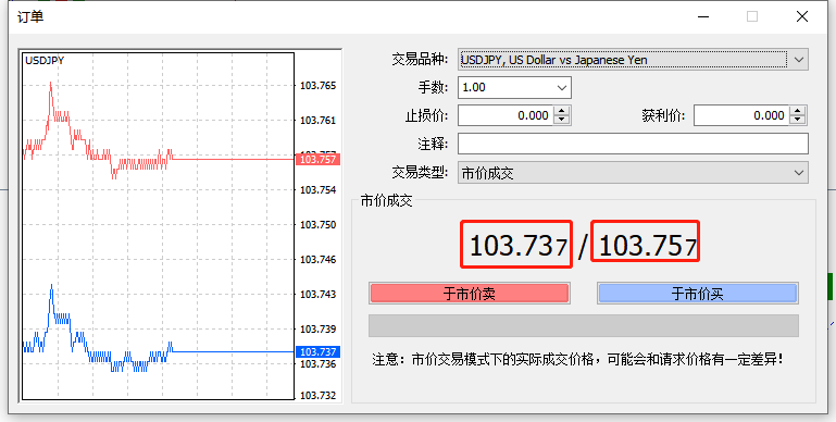 理解了基点的概念,就可以比较容易的理解点差的概念。任何交易品种都有买入价和卖出价,比如上面两张图中,“于市价卖”代表的就是卖出价;“于市价买”代表的就是买入价。买入价减去卖出价,得到的就是点差。以上图中的EURUSD为例,买入价(1.2148),卖出价(1.2146),两者相减得到0.0002,也就是点差为2 。可以看出,点差就是买卖价格差值所包含的基点数量。部分人会有疑问:如果我把十万分位也计算进去,那么买卖价格差值就是(1.21483)-(1.21461)=0.00022,也就是点差为2.2,岂不是更精确?这种做法是对的,没有问题。但必须讲点差为2.2,而不是22,因为点差的最小单位在万分位。