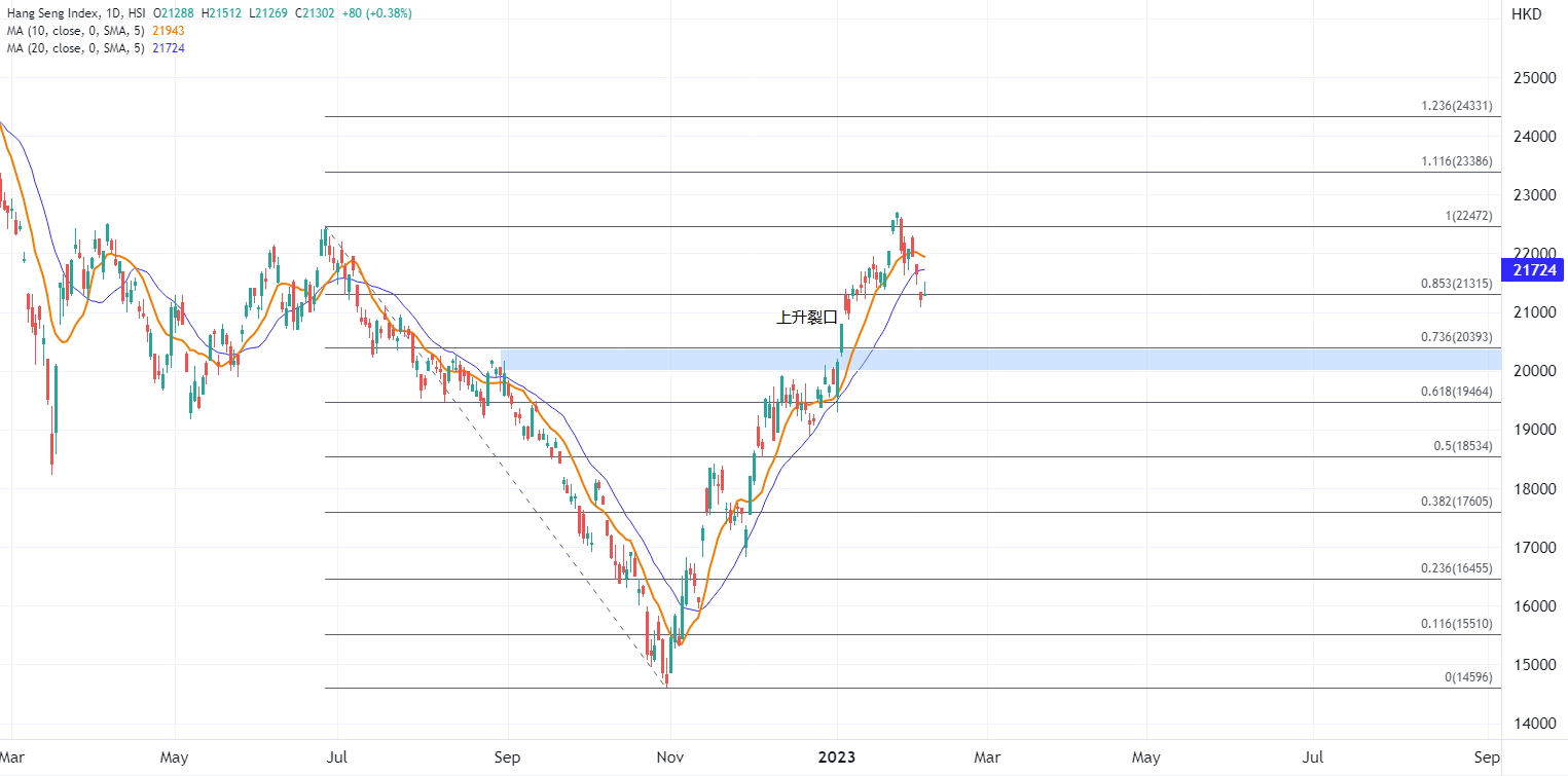 日内港股情绪有所回暖,部分考虑上周外围主要的不确定因素落定,技术上暂时在一个月低位获得支撑,21000关口守住的话短线有望上测日图均线在22000附近的阻力,但是自1月底以来的波调整浪依然未完成,或回补1月初的上升裂口,届时看低至20393至20000关口的支撑。