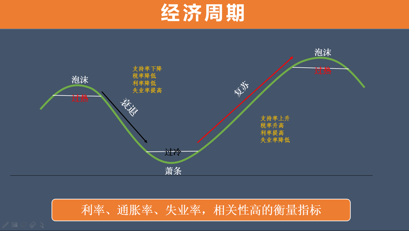 由于衡量经济周期最重要的就是经济指标,例如;CPI、利率、失业率、GDP增速等等,所以研究周期就是研究经济指标。在确定当前所处位置后,就可以按照周期的变动方向配置资产。美林投资时钟就是在这一理念之下诞生的实用性投资模型,让人们更加方便的理解并运用经济周期规律。