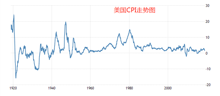 上图是美国CPI将近一百年的走势图:在1960年之前,通胀率数值变动区间大体在25%~-15%之间;1960年至1980年间,通胀率数值变动区间大体在15%~0%之间;在1980年之后,通胀率波动范围在5%~-2%的区间之内。如果说经济周期的根本就在于循环,而从美国最近一百年的历史当中,却看不到波动幅度的循环,只有无尽的涨涨跌跌,且不具有明显的均匀时间周期性,相反,涨跌的时间点非常杂乱和随机。
