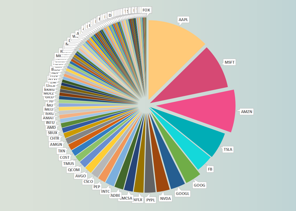可以看出,Apple(苹果)所占权重高达12.637%,这一比重超过了数十支低权重个股的权重总和。前十支权重股的权重总和,经过简单计算后,为52.403%,占据纳斯达克指数的半壁江山。这是非常畸形的权重分配模式,无法体现大部分个股的涨跌表现。