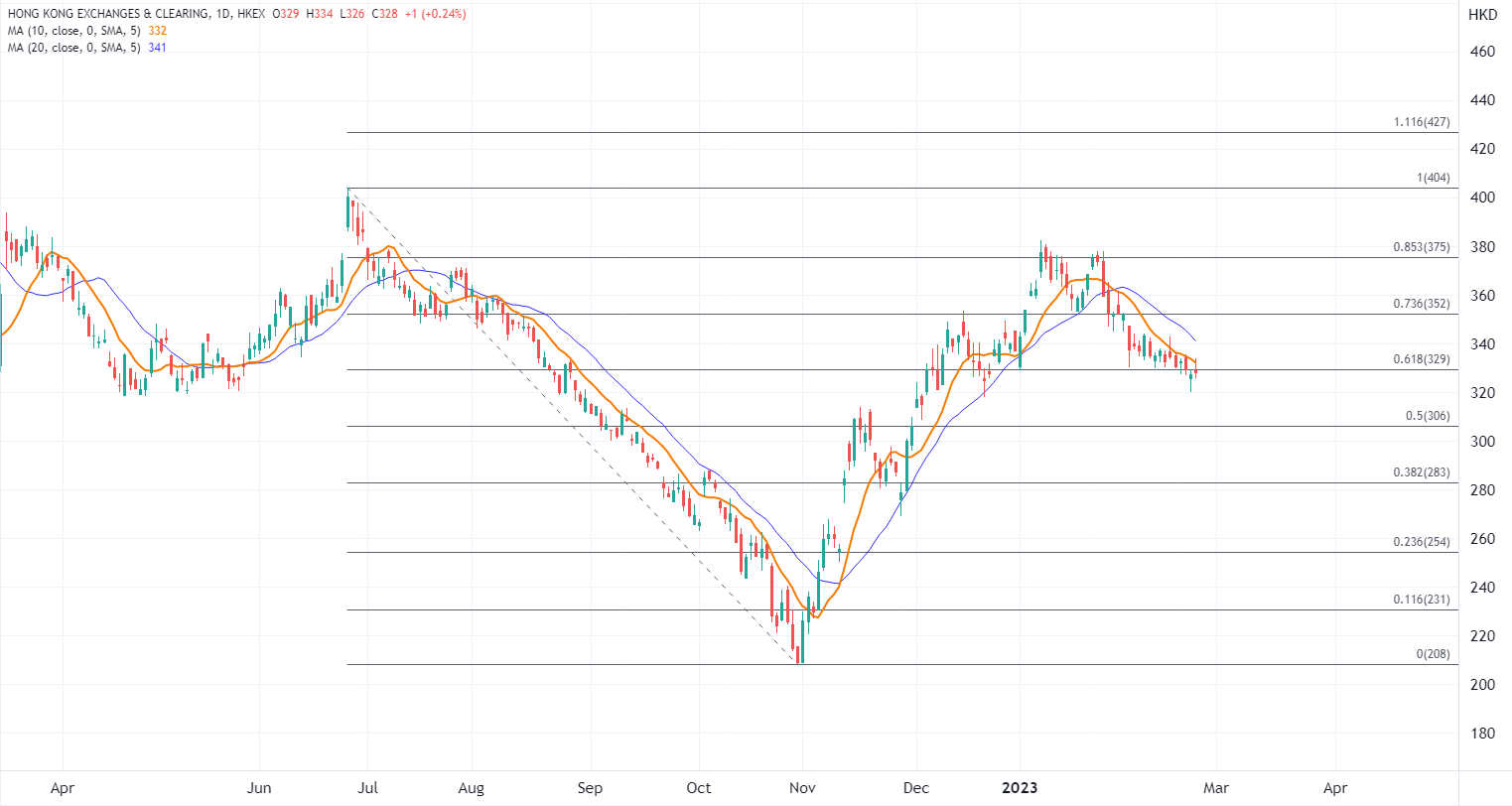 绩后港交所午后一度升2%后升幅收窄,技术上在日图10均线阻力下,当前关注下方320港元,该位在以往曾多次充当关键支撑,如果因此反弹有机会再试均线阻力,但大市暂时乏力提供支撑,股价可能继续受限,后市如果继续向下,不排除低看300至280港元。