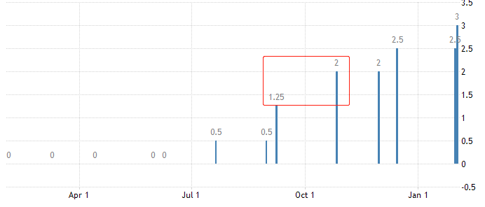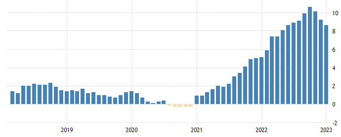 2022年欧央行总计加息四次,最大的单次加息幅度为75基点,将基准利率从1.25%升高至2%,如下图中红框所示。截至目前,欧央行最新基准利率为3%,是2009年以来的最高值。维持高利率的主要目的就是抗击欧元区内的高通胀问题,衡量高通胀的核心指标是CPI增速。