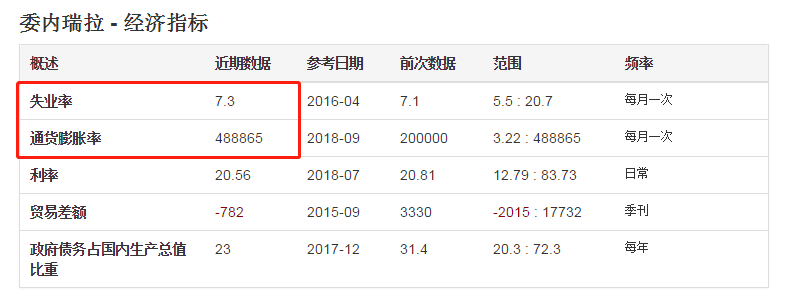 能够引发民众恐慌的指标,描述的一定是与民众结合最为紧密的事物。试想,如果你早上还能买一只鸡的钱,到了晚上只够买一个鸡蛋,会不会有恐慌感?试想,如果听到自己所从事行业内的企业纷纷倒闭破产,大量工人白领失业回家,你会不会有恐慌感?答案是:一定会,因为害怕改变是人的本性。通胀率和失业率就是对以上两种情况做预警准备的。以史为鉴,我们以委内瑞拉为例来进行解释。