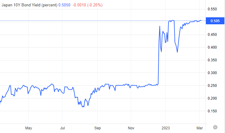 YCC政策指导之下,日本央行将十年期日本国债收益率波动范围限定在±0.5%。由上图可知,十年期日本国债最新收益率0.505%,已经达到调控上限。国债利率走高意味着市场正在预期日本央行将开启加息政策。去年12月20日,日本央行曾经扩大日本国债收益率的调控区间,从±0.25%扩大至正负0.5%,此举导致了上图中曲线的跳涨。从失业率和CPI增速的角度看,不久之后,日本央行将再次扩大调控区间。