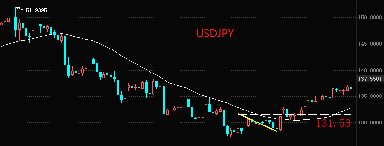 技术角度看,USDJPY已经上涨突破均线压制,中期趋势由空转多。图中所示黄色斜线是多头趋势当中的第一次回调,其所形成的支撑位在131.58。如果未来市场行情开启第二次回调,只要不突破131.58,则多头力量仍占据优势。