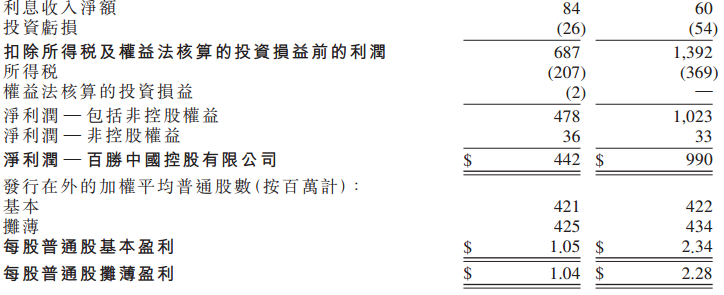 非经营损益方面,2021年投资正收益2600万美元,利息支出总额8400万美元,所得税总费用2.07亿美元。扣除上述损益之后,归属于所有股东的净利润为4.78亿美元,其中归属于控股公司的净利润为4.42亿美元。归母净利润同比跌近腰斩,表现较差。每股普通股收益1.05美元,按照7.8497的汇率计算,约为8.24港元。百胜中国港股最新股价484港元,经过计算,市盈率PE为58.7倍,估值偏高。