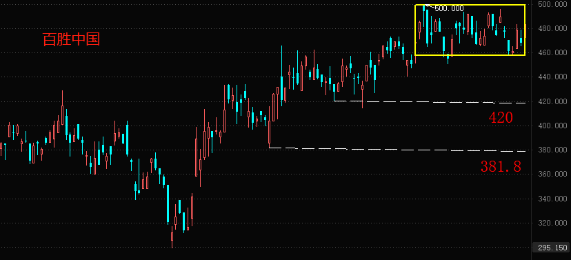 技术角度看,1月20日以来,一直处于图中黄色方框内的震荡区间当中,多头趋势虽然仍在维持,但上涨速率较慢。下方第一重支撑位在420港元附近,第二重支撑位在381.8港元附近。在两个支撑位被有效跌破之前,百胜中国股价维持强势状态的可能性较高。