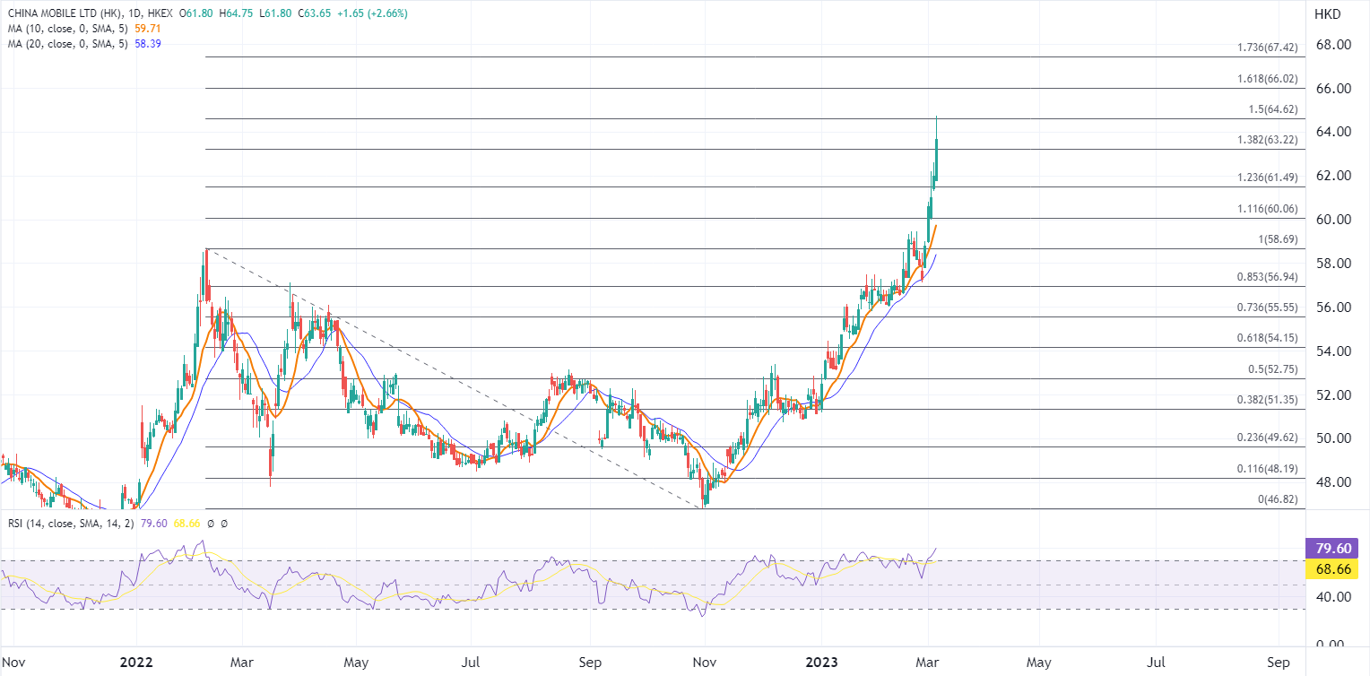 中移动(00941)股价经过五日连涨,已经累计上涨近10%,当前处于超买状态,在继续挑战66港元之前留意可能触发回吐,届时可能向60港元靠近考验均线的支撑。