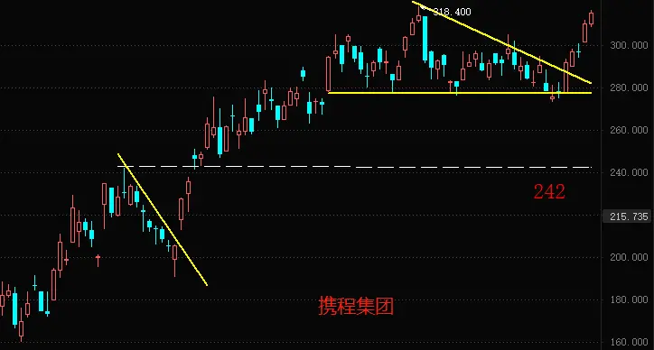 技术角度看,携程集团的股价刚刚摆脱下降三角形整理形态的束缚,短期涨势较强。携程集团在港股上市以来的历史最高价为326港元,市场价格314.8港元,已经非常接近历史最高点。前一个震荡中枢位的支撑点在242港元,如果市场价格回落,只要不跌破该支撑点,则多头趋势仍能延续。3月份以来,恒生指数也进入反弹周期,乐观的投资情绪将对携程集团股价形成积极影响。