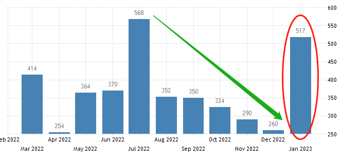 从上图可以看出,2月份的非农就业人口异常放大,严重缺乏连续性。2022年7月份~12月份,美国的非农就业人口从新增56.8万人降低至新增26万人,每个月份减少一部分,数据趋势连续性较强。只有今年一月份数据异常放量、突然走高。这不得不让人怀疑1月份数据存在失真的情况。基于此种判断,本周五的非农就业报告显得至关重要。如果新增非农就业人口降低至20万人以下,表示一月份的非农数据只是短暂反弹,不具有持续性。如果本周五的新增非农业人口依旧维持在50万人高位,则大企业裁员和经济数据良好的矛盾将更为凸显。