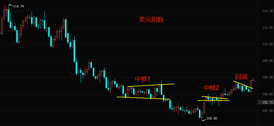 虽然从美联储货币政策和债券市场收益率角度都可以分析出美元指数的反弹走势不会持续太久,但是,美元指数的技术走势却给出相反的结论。在当前的反弹波段当中,中枢2已经深入到中枢1的区间之内,这是趋势转折的特征。最近的一次回调低点没有和中枢2重叠,意味着反弹走势仍将延续。叠加昨日长阳线突破回调波段的高点,所以技术角度看,美元指数延续涨势的概率较高。