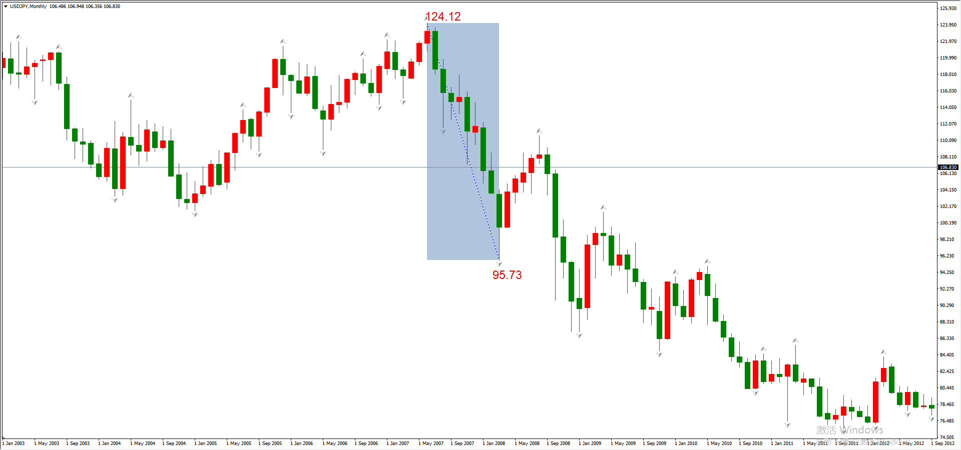 2008年最大的风险事件是次贷危机,我们来看USDJPY的走势表现。由于次贷危机真正的开始时间是在2007年8月份开始,至2008年8月份达到高潮(美国房利美和房地美倒闭),所以我们选择的最高点为2007年的最高点124.12,选择的最低点为2008年的次低点95.73。这段时间里,USDJPY下跌幅度为22.87%,避险能力显而易见。