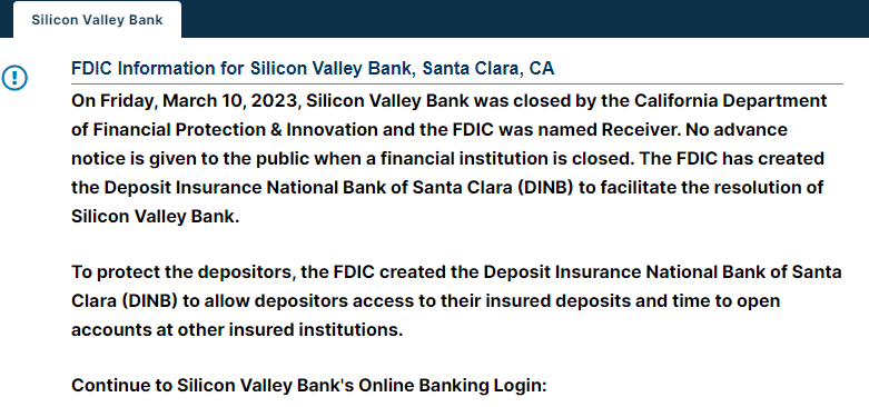 ATFX港股:3月9日,在纳斯达克交易所上市的硅谷银行(代码:SIVB)大跌60.41%,市价从前一日收盘价267.83跌至最低100美元,当日成交额48.64亿美元,换手率高达65.45%,恐慌性抛售迹象显著。硅谷银行母公司SVB Financial Group受拖累,3月9日股价下跌21.9%,收盘在15.23美元。股票市场剧烈波动的起因是:3月9日,SVB Financial Group表示已经出售其投资组合中约210亿美元的证券,这将导致第一季度税后亏损18亿美元。消息公布后,几家风险投资公司建议其投资组合公司从硅谷银行撤资,进而出现420亿美元的储户和投资者的挤兑行为。硅谷银行存款总额为1730亿美元,420亿美元的挤兑约占其存款总额的24.28%,大部分银行的现金流都无法承受如此严重的挤兑,硅谷银行也不例外。3月10日,美国加州金融保护和创新部以流动性不足和资不抵债为由,令硅谷银行倒闭,并由美国联邦存款保险部门接管了剩余存款。硅谷银行的官网已经切换为美国联邦存款保险部门的公告,如下图: