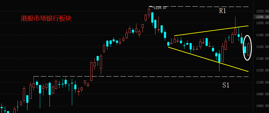 港股市场银行板块今日上涨1.35%,投资情绪较为乐观,并未受到硅谷银行倒闭的直接影响。技术角度看,2月6日至今 ,银行板块K线图呈现出喇叭口形态,目前尚未有突破迹象,预计震荡将会加剧。上方阻力位R1为年内高点,下方支撑位是前一震荡中枢的上限S1。板块内涨幅最大的是江西银行(3.03%),跌幅最大的是郑州银行(-1.82%)。香港本土银行恒生银行涨幅0.51%,今日表现较为平淡。