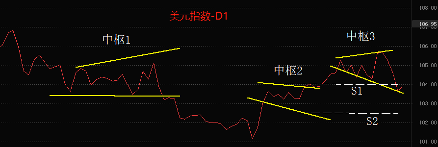 美元指数将再迎冲击。上周五美元指数下跌0.57%,本周一美元指数再跌 0.97%,今日美元指数极有可能再次下跌0.5%以上,并彻底稳定在104整数关口之下。受益于美元指数走弱,黄金价格已经占上1900美元关口,欧元兑美元也已经逼近1.07高位。我们倾向于认为,上周五的非农数据和硅谷银行的倒闭事件,将成为美元指数二月份反弹的转折点。今年上半年,美元指数有可能跌穿100整数关口。技术角度看,美元指数在2月24日至今的回调已经演变为中枢3,市场价格触及中枢二的上限S1,这是趋势转折的典型特征。