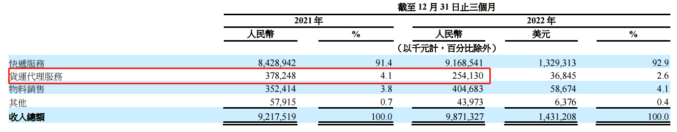 细分业务来看,2022年第四季度,快递服务和物料销售收入均实现同比正增长。货运代理服务收入同比大降32.8%,官方给出的解释是:疫情因素消退,导致跨境电商需求量减少,货运代理服务定价趋于正常化。2022年全年货运代理服务收入同比下降20.07%,收入减少的原因与四季度基本相同。由于货运代理服务的收入占总收入的比重约为5%,处于非常低的水平,所以对应收总额的影响并不大。
