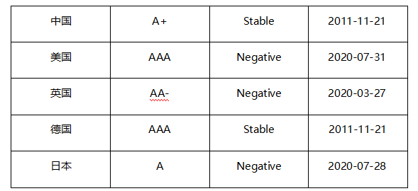 当前,比较知名的评级机构有三个,分别为标准普尔(美国)、惠誉(美国)和穆迪(美国)。他们对一个国家主权的评级标准不完全相同,但评级结果大同小异。本文以中国、美国、英国、德国、日本,五个国家为例来介绍三大评级机构。