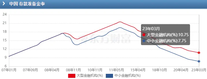 2011年6月份,中国金融机构的存款准备金率处于峰值状态:大型金融机构的存款准备金率为21.5%,中小型金融机构的存款准备金率为19.5%。此后的十二年间,存款准备金率不断调降。经过22次下调之后(包含本次),金融机构的存款准备金率创出2007年一月份以来的最低值。为什么人民银行要一直降低存款准备金率呢?答案是:提振宏观经济。2007年4月份,中国的GDP季度增速年率最后一次站上15%,之后便进入漫长的回落状态。2022年四季度的GDP季度增速年率为2.9%,2022全年增速3.0%,既低于年初5.5%的政府目标,又远远低于2007年4月份的峰值。2023年的GDP增速大概率继续下降,因为国民经济的支柱产业——房地产开发,仍旧没有出现实质性的好转。所以人民银行降低存款准备金率的政策路径不会改变。