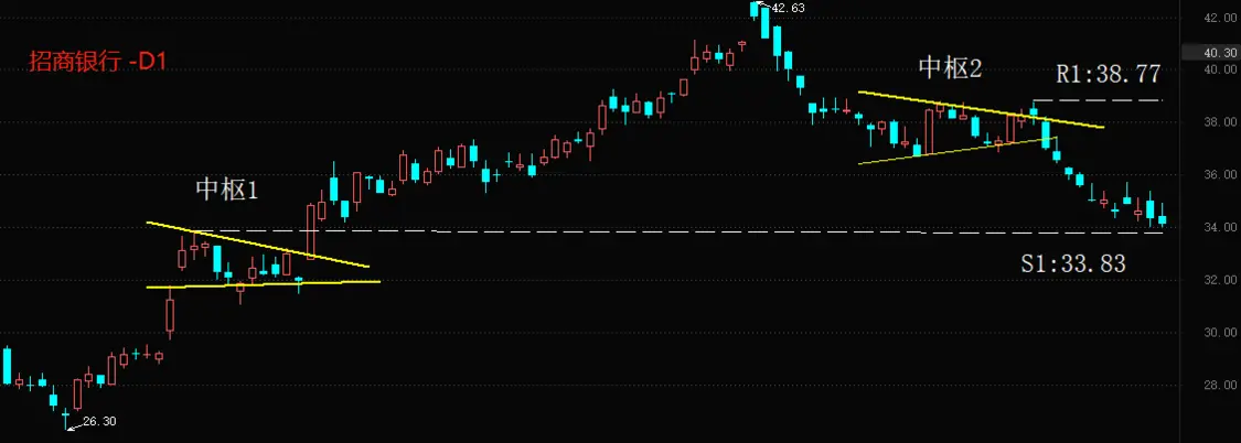 招商银行在港股和A股市场两地上市。港股股价下跌1.98%;A股市场股价下跌0.7%,受到降低存款准备金率消息提振的迹象不明显,但相比外资银行来说已经非常具有抗跌特性。技术角度看,招商银行的股价即将进入中枢1的范围之内,这是趋势转折的典型信号。如果S1:33.83被有效跌破,则招商银行的多头趋势宣告终结。