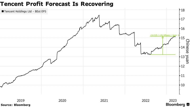 在股价长达一年的暴跌之后反弹,分析师们正在重新评估腾讯的合理估值,并一致认为该股有巨大的上涨潜力。根据彭博社汇编的数据,今年的盈利预期增长了5%以上,而分析师的目标是未来12个月股价将上涨33%。