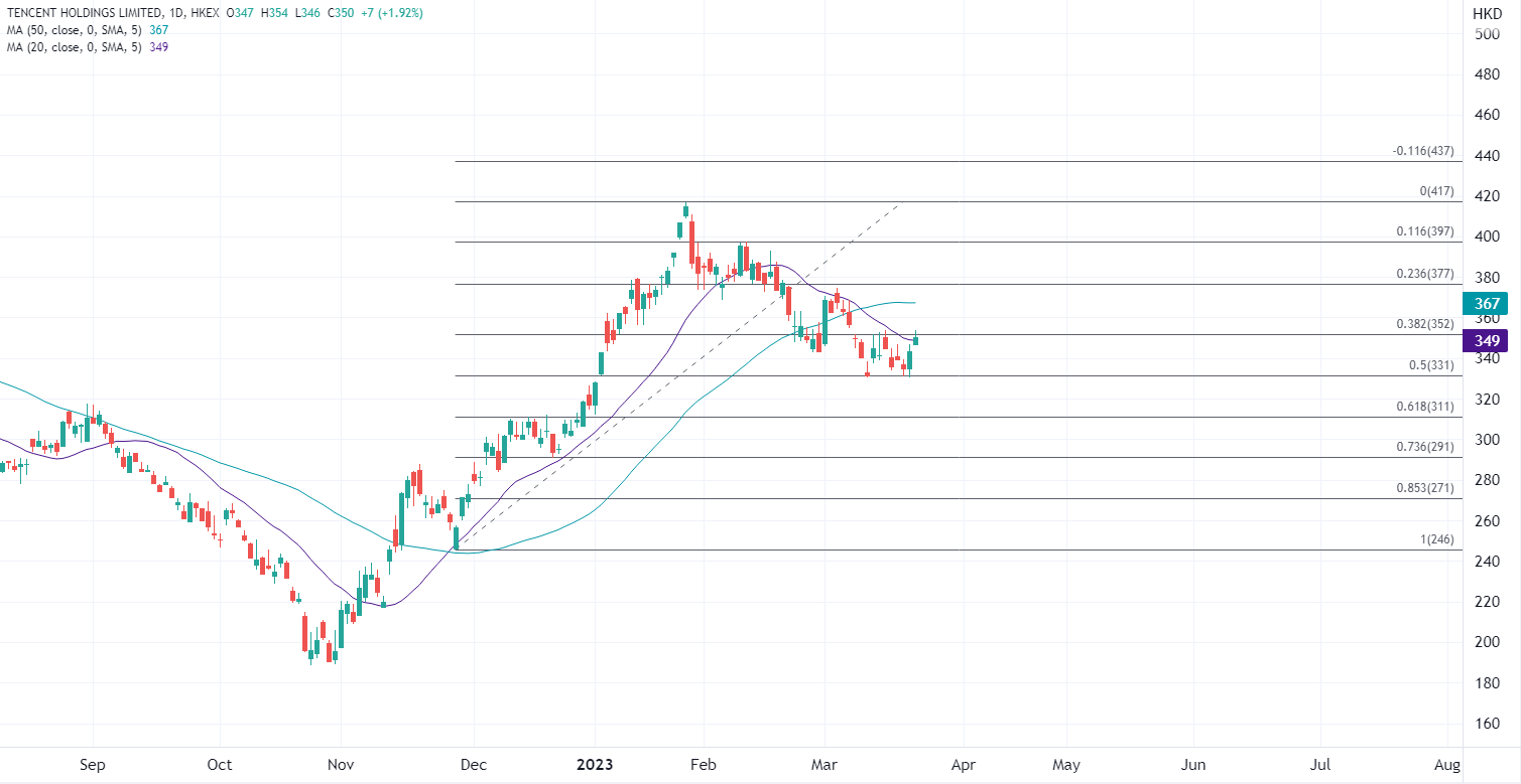 日图显示,腾讯股价近两周以来一直处于区间模式,当前尝试上破区间顶部也是20均线所在,如果业绩后带来突破,意味着带来技术反弹可继续上望377及400港元的心理关口。