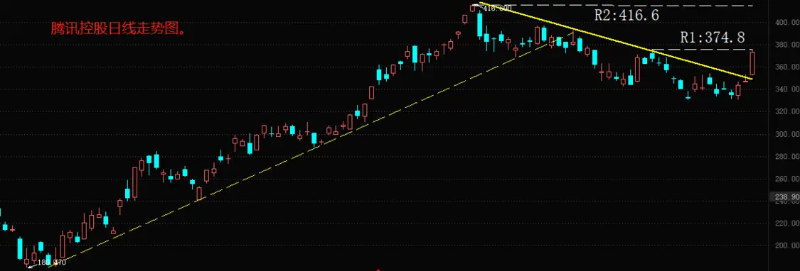 2022年财报发布之后,腾讯控股实现7%以上的涨幅,表明股票市场对这份财报十分满意。就像我们在前面提到的,虽然腾讯控股的营收和净利润双双下降,但四季度已经出现好转迹象,这一点是股票市场判定此份财报为利多影响的关键所在。技术角度看,腾讯控股日线级别的股价存在两个阻力位:R1 374.8港元和R2 416.6港元。由于1月30日开始的回调波段,跌势较为温和,表明空头抛售并不激烈。从今日开始的本轮反弹有可能一举击穿R2 416.6的阻力位。