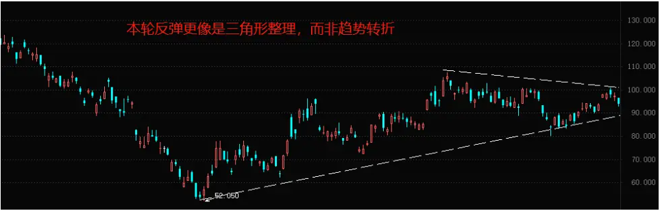 技术角度看,自去年10月31日开始的反弹,逐渐演变成了三角形整理形态。空头趋势仍在延续,一旦下方支撑线被突破,则意味着下跌波段的开始。从收敛三角形的角度看,向下突破的临界点即将到来。周线级别的形态同样支持空头趋势判定,只是反弹衰竭的迹象尚不明显。