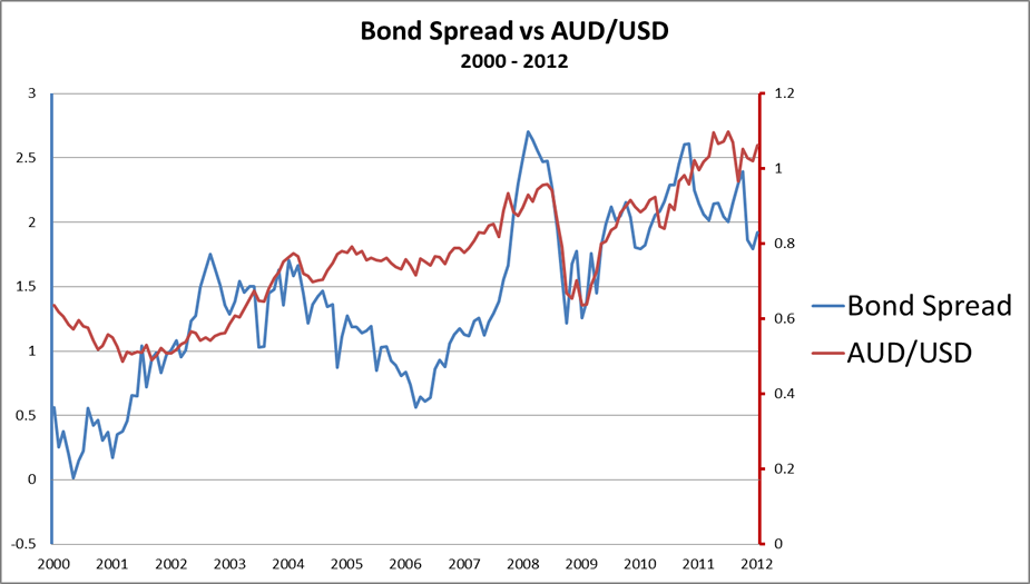 当债券息差从2002年到2004年从0.50%上升到1.00%时,澳元/美元上升了近50%,从0.5000上升到0.7000。2007年也发生了同样的情况,当时美国国债利差从1.00%升至2.50%,澳元兑美元汇率从0.7000升至略高于0.9000,这是2000标准点的涨幅。