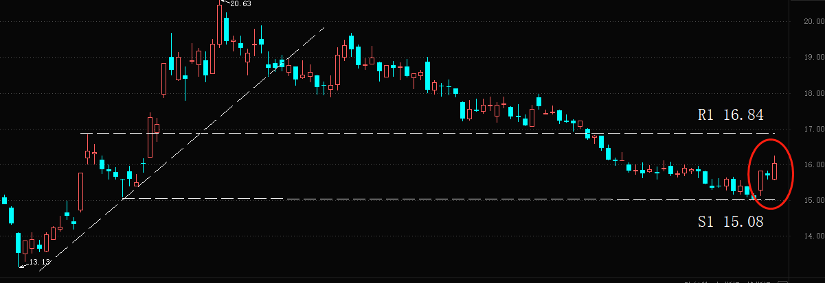 技术分析角度看,最近三个交易日,万科股价持续上涨,累计涨幅6.65%。三个交易日的平均成交量显著升高,资金入场情绪高涨。短期阻力位在图中R1 16.84元,短期支撑位在S1 15.08元。R1至S1是前期上涨波段的中枢区域,可靠性较强。预计本月万科股价有可能涨破16.84的阻力位,但能否突破近半年高点20.63元尚需进一步观察。