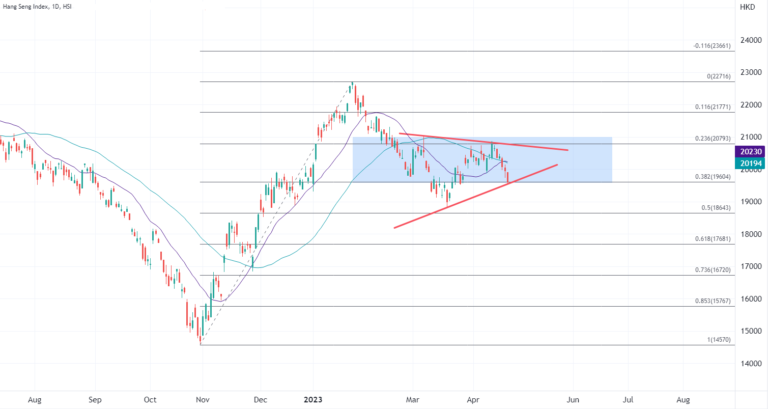 ATFX指出,港股下周即将迎来密集的业绩期,本周市场的观望情绪可能继续让恒指维持承压,日图恒指下破均线范围后打开20000点关口下方空间,若日内收低于通道底部,意味着前低在19000附近成为目标。