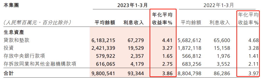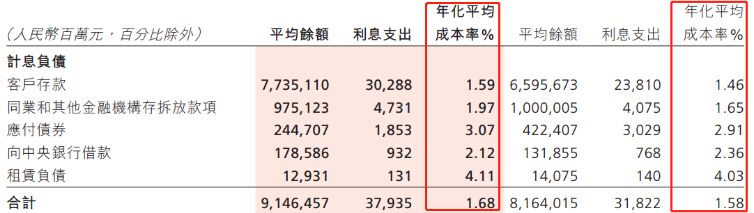 存款端的利率却在上涨。客户存款利率从1.46%升高至1.59%,同业款项利率从1.65%升高至1.97%,这就是所谓的“推升计息负债成本”。贷款和垫款的总额6.18万亿元,利率4.41%;客户存款总额7.735万亿元,利率1.59%。两者利差2.82%,相比去年同期的3.22%,下降40基点,降幅较大。
