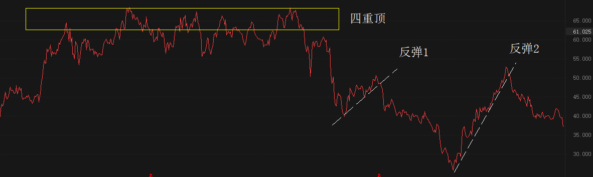 纯技术角度看,招商银行在2021年2月至2022年2月之间形成四重顶,终结前期上涨趋势。2022年3月至今,股价处于持续下跌状态,期间出现两次反弹,如图中反弹1和反弹2处。今年1月份开始,招商银行反弹遇阻后重新进入空头趋势状态。目前尚未探寻到可靠支撑位,预计跌势延续,中期目标位在30元关口。