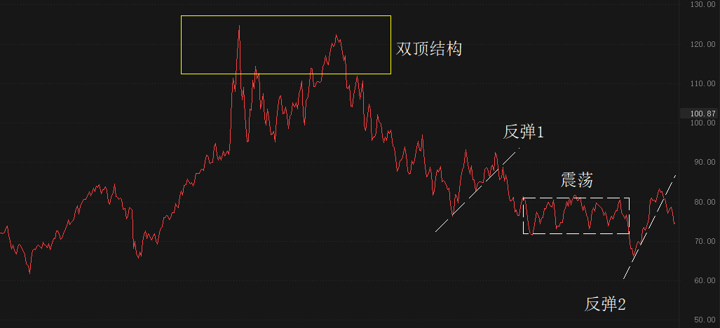 2022年3月至6月,WTI形成双顶结构,终结了此前的上涨趋势。2022年7月至今,下跌行情成为主流,期间出现如图中所示的两次反弹和一次箱体震荡。反弹2已经在4月19日下破反弹趋势线后终结,新一轮下跌波段开启,中期目标位在65美元左右。天然气的价格走势对于石油价格走势具有引导作用。2022年11月开始,天然气价格就进入单边跌势,期间没有出现任何显著反弹。市价价格从6.912美元/百万英热下降至2.307美元/百万英热,跌幅超60%。同期的原油价格跌幅约在15%左右,主要原因就是受到OPEC+减产的干扰。我们认为,在OPEC+减产作用消散后,原油价格将有可能出现补跌行情。