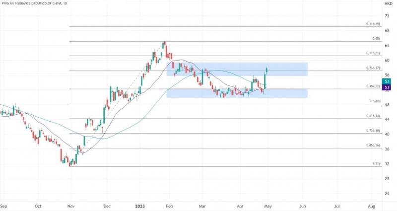 ATFX港股:周四(4月27日)中国平安AH股表现强劲,开盘即大涨。A股收盘封涨停板,报价50.37元,为2015年8月以来首次,全天成交126.57亿元,位居A股第一。H股(2318.HK)盘中最高涨10.18%报56.8港元。周五早段股价继续向上,录得超过两个月最高位。
