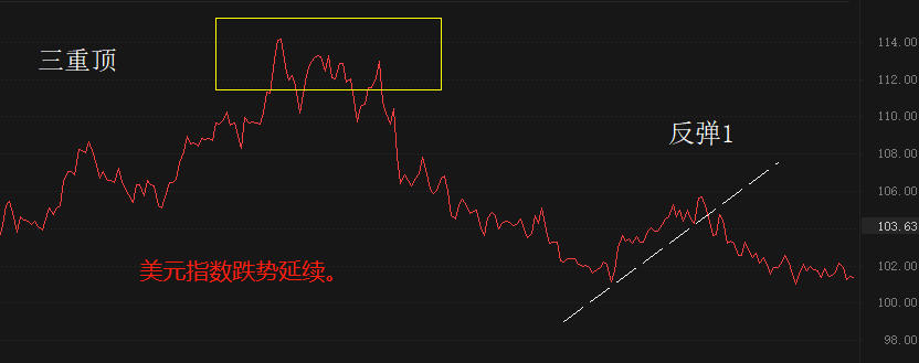 纯技术角度看,美元指数的跌势将会延续。2022年10月份,美元指数形成三重顶之后,开启持续时间较长的下跌走势。今年二月份出现了显著反弹,在106附近遇阻,随后重启跌势。从三月中下旬开始的跌势,虽然力度不强,但一直在试探强支撑101关口。如果本月能够有效跌破101关口,美元指数将迎来驱动浪级别的下跌。