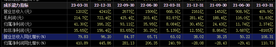 一季报显示,比亚迪营收总额1202亿元,同比增长79.83%,成长性极高。归属母公司净利润41.3亿元,同比增长410.89%,翻四倍有余。无论从营收还是利润角度看,比亚迪都处于扩张态势之中。行业内的其它企业,比如“蔚小理”,虽然一直处于亏损状态,但营收增速保持在较高水平,分别为36.34%、27.95%、67.67%。