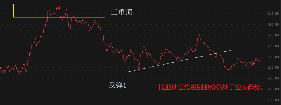 纯技术角度看,比亚迪日线级别股价仍处于空头趋势。比亚迪的股价在2022年6月和7月形成三重顶,终结了此前的上涨趋势。2022年7月下旬至今,比亚迪股价一直维持下跌走势,期间出现过一次如图所示的反弹。最近两周的走势有开启第二轮反弹的可能性,但由于涨幅非常有限,所以尚无法给出“趋势由空转多”的结论。